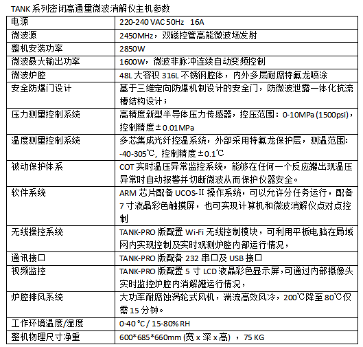 TANK使用ARM芯片配備UCOS-Ⅱ操作系統,運行穩定可靠。采用7寸液晶彩色觸摸屏,觸控操作流暢簡便。頁面實時顯示工作狀態及溫壓變化曲線。內置專家方法庫,也可自行編輯及存儲用戶方法。內置COT實時溫壓異常監控系統能夠在任何一個反應罐出現溫壓異常時自動報警并切斷微波從而保護儀器安全。PRO版獨有Wi-Fi無線控制模塊,既可實現計算機和微波消解儀點對點的控制,也可利用平板電腦等在局域網內實現控制及實時觀測,使用戶“舒心實驗、安全實驗”。PRO版亦采用雙屏設計,另配5寸LCD液晶彩色顯示屏通過內部攝像頭實時監控爐腔內消解罐運行情況。